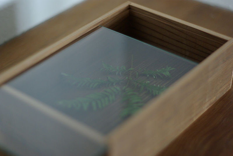 古材の箱に、ガラスの蓋を組み合わせて作った「花箱」。
